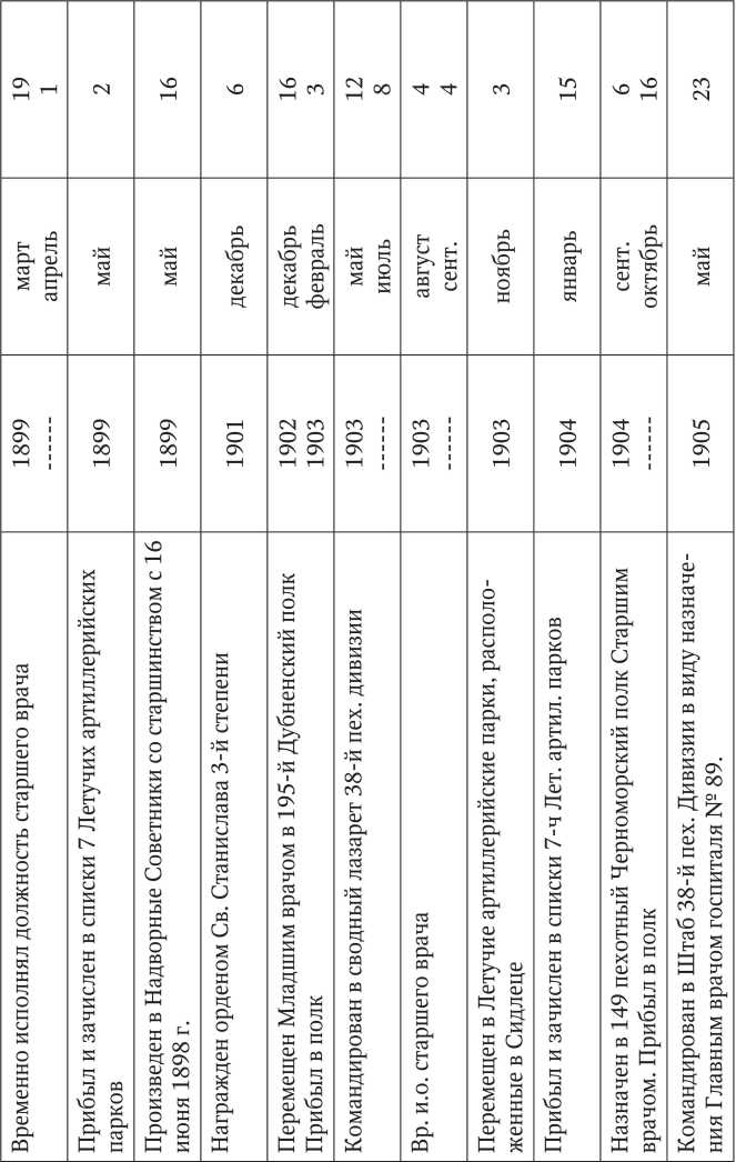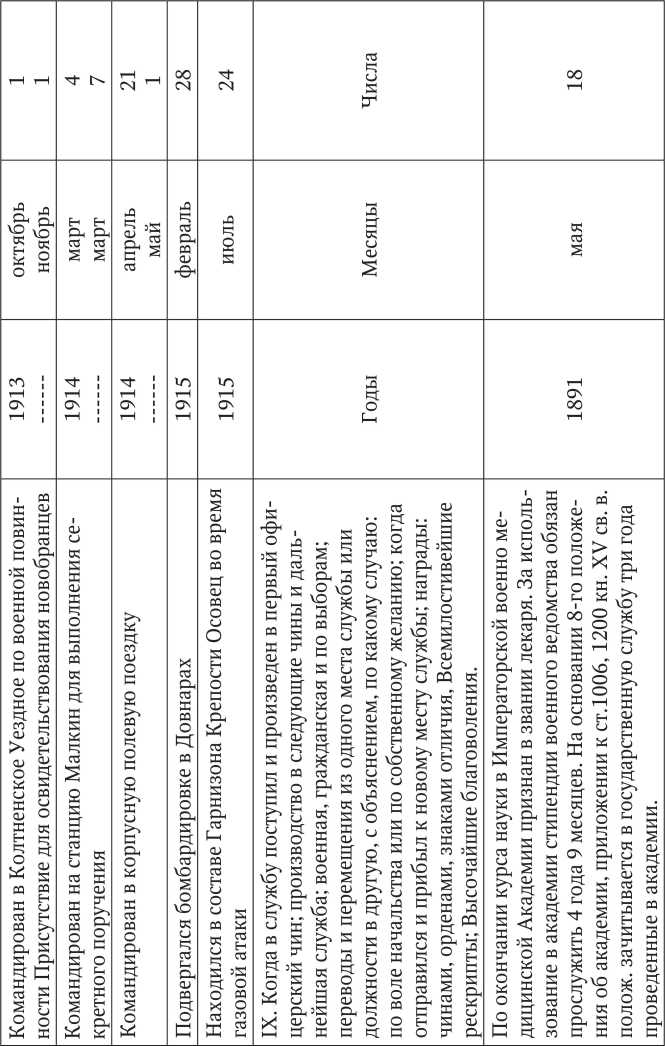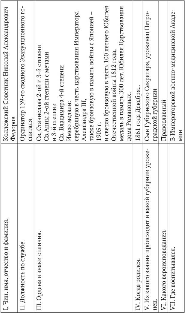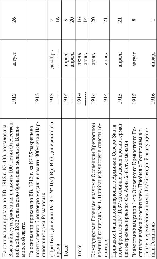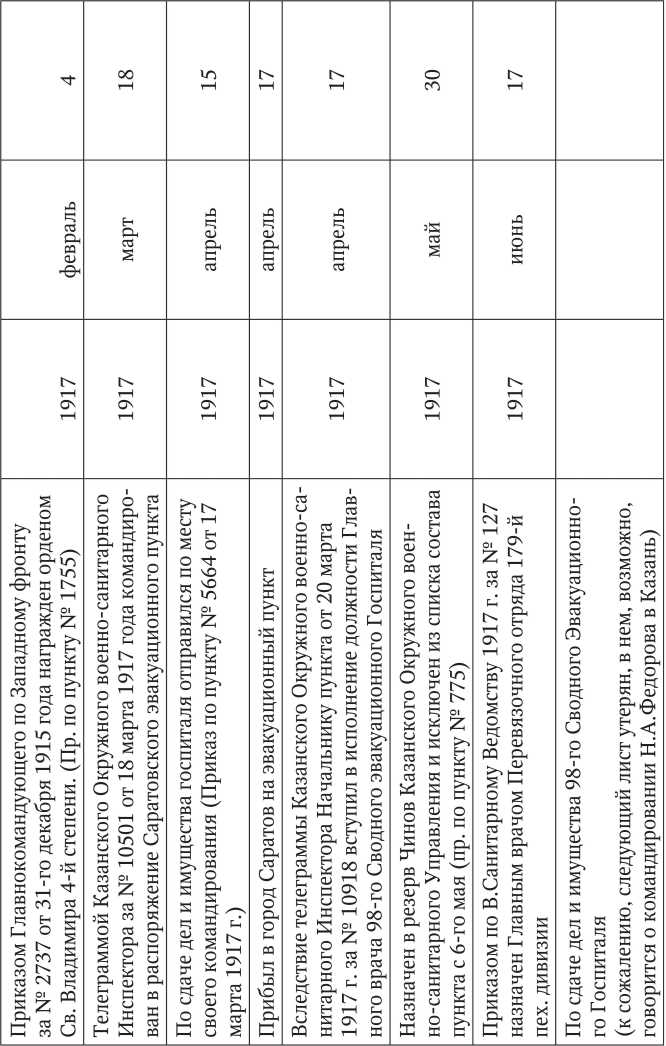 Очень скромная запись по поводу своего участия в Первой мировой войне также имеется в послужном списке Н.А. Федорова, составленном им в 1918 г.: «Исполнял обязанности Главного врача 16 — ой пехотной дивизии по 14 июля 1914 г. 20 июля 1914 г. командирован Главным врачом в Осовецкий крепостной военный госпиталь № 1. 28 февраля 1915 г. подвергался бомбардировке в Довнарах. 24 июля (старый стиль, по новому стилю — 6 августа, прим. авт.) находился в составе гарнизона крепости Осовец во время газовой атаки. 8 августа 1915 г. (т. е. 21 августа по новому стилю, прим, авт.) вследствие эвакуации 1-го Осовецкого крепостного госпиталя, выбыл с госпиталем. Прибыл с госпиталем, переименованным в 177 сводный эвакогоспиталь в Пензу» (Рис. 30).