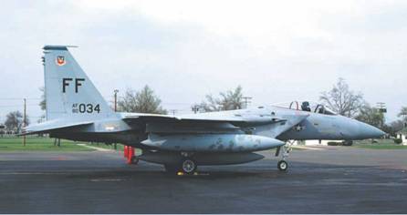 F-15C (№80-0034), потерпевший аварию 2 ноября 2007 г. в Миссури. Фото сделано в марте 1982 г., когда самолет только поступил на службу ВВС США