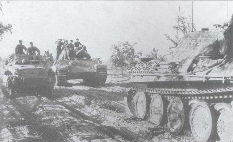 На переднем плане — командирский танк Sd.Kfz.267, сзади — «Пантера» Ausf.G и бронеавтомобиль Sd.Kfz.234/3. 5-я танковая дивизия СС «Викинг», Восточный фронт, Польша, август 1944 года