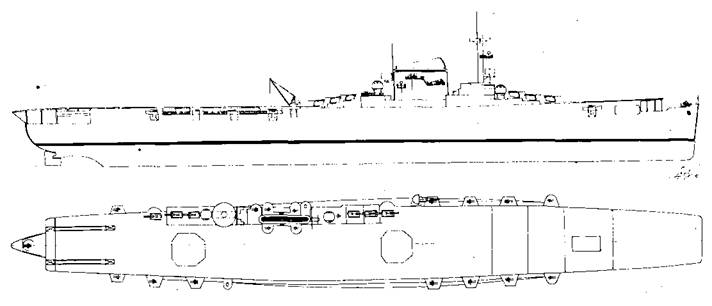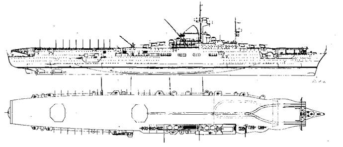 Таблица 2.4 Проекты авианосцев специальной постройки Элементы / тип корабля "Граф Цеппелин II" "А I" "21 000-тонный” Для действий против судоходства Малый для серийной постройки Малый 1. Водоизмещение, т: — стандартное 24 114 26 612 21 000 • • 13 287 — полное 31 ООО 37 000 26 000 18 000 15 000 17 000 2. Размеры, м: — длина КВЛ 245 245 255 196 172 180 — ширина 28 32 26 22 22 23 — осадка 8.5 8.75 8 7,6 7,25 7,5 — ширина ангара 18 21 18 18 18 18 3. Главные механизмы: — тип установки дизеля или дизеля и котлотурбинная дизеля дизеля дизеля дизеля дизеля — суммарная мощность, л. с. 180 000 или 120 000 и 60 000 210 000 175 000 90 000 46 000 12 000 — число ТЗА — или 1 — — — _ _ — число котлов — или 4 — — — — — — число дизелей 3 пары или 2 пары 3 пары 5 4 3 2 пары — число винтов 3 или 2 и 1 3 3 3 3 2 4. Скорость хода, узлы 34 34 34 30 26 33 5. Дальность плавания,миль: — скоростью хода 19 узлов 15 000 18 000 18 000 1800 18 000 12 000 6. Вооружение, число: — истребители Me-109F 10 12 15 12 12 9 — бомбардировщики Ju-87D 12 20 18 16 10 6 — вспомогательные самолеты 20 — — — _ 3 — катапульт 2 2 2 2 2 2 — 150/55 АУ 8x2 8x2 4x2 4x2 4x2 — — 105/65 ун. АУ 6x2 8x2 6x2 4x2 4x2 2x2 — 37/80 зен. АУ 11x2 9x2 7x2 8x2 8x2 8x2 — 20/65 зен. АУ 7x4 — 3x4 3x4 4x4 6x1 — 533-мм торпедных труб — — бподв. — — — 7. Бронирование, мм: — полетная палуба 20 20 • • • 20 — броневая палуба 40 100 45 • • 50 — скосы 60 100 • • • • — борт 100—80 • • 45 • 50 — казематы 150-мм АУ 20 50 60 60 • • — 105-мм АУ 10 10 10 10 10 10 8. Дата подписания проекта • 9.4.42 15.7.42 18.06.42 5.06.42 •