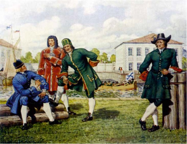 В свою очередь, родственники первой жены царя Алексея, Милославские, возглавляемые умной и властной царевной Софьей, сумели настроить стрельцов против Нарышкиных, и 15 мая был совершен государственный переворот. В результате стрельцы добились того, что, согласно их требованиям, на престоле помимо Петра оказался его старший брат Иван, а по молодости лет братьев реальное управление перешло в руки Софьи, ставшей регентшей. Наталья Кирилловна вместе с домочадцами отбыла в Преображенское. Начинался новый этап в формировании Петра, который превратил ранние свои забавы в более серьезные занятия, положившие начало будущим масштабным военным преобразованиям и созданию российского флота. Этому также способствовали и иностранцы, с которыми Петр успел познакомиться, поскольку рядом с Преображенским находилась Немецкая, Иноземная слобода, населенная представителями разных стран. Под влиянием П. Гордона, Ф. Тиммермана, К. Бранта и других образованных, сведущих европейцев Петр начал постигать науки и специальности, необходимые для военачальника и флотоводца. Теория дополнялась практикой. В частности, военные «потешные» игры становятся более похожими на маневры с применением огнестрельного оружия и артиллерии, участием целых полков. Найденный в сарае в Измайловском английский бот стал первым судном, на котором Петр овладевал начальными навыками судовождения. Затем последовали первые опыты на реке Яузе, Просяном пруде, Кубенском озере. Как и в сухопутных учениях, в этих плаваниях Петра «денно и нощно» сопровождали взрослевшие вместе с ним сверстники, «потешные», «комнатные», более взрослые «стряпчие конюхи»[5], составившие ядро знаменитой петровской гвардии, Семеновского и Преображенского полков. К 1686 г. Преображенское походило на настоящий военный городок с крепостью с башнями, караулами, кордегардией, оружейным двором, съезжей канцелярией; у гарнизона имелись пищали, пушки, знамена. На Лебедином пруду за Боровицкими воротами начали спускать первые шнявы и карбасы.