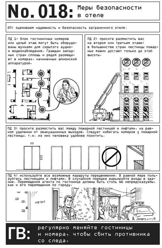 ГВ для обывателя: отели привлекают и мелких уголовников, и профессиональных аферистов. Особенно удобно преступникам подстерегать жертву в лобби: персонал почти никогда не задает вопросов. К счастью, в отелях бывает несколько входов и выходов: варьируйте их беспорядочно, чтобы никто не смог отследить и зафиксировать схему ваших перемещений.
