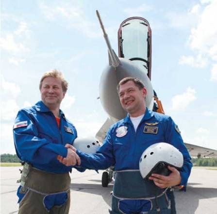 Генеральный директор РСК «МиГ» Сергей Коротков (слева) и шеф-пилот фирмы Михаил Беляев после полета на МиГ-35 на праздновании 60-летия ПК1 РСК «МиГ». Луховицы, 31 мая 2013 г.