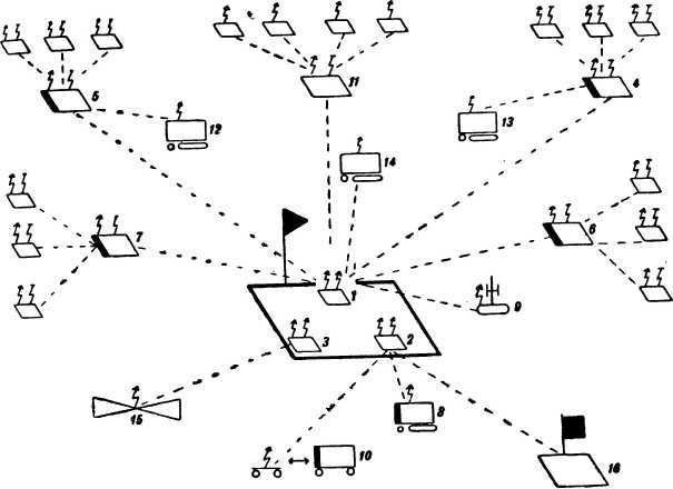 Рис. 5. Схема радиосвязи усиленного танкового батальона: 1 — командир батальона; 2 — начальник штаба; 3 — помощник начальника штаба; 4, 5, 6, 7 — танковые роты; 8 — мотопехотная рота; 9 — батарея самоходных орудий; 10 — рота снабжения; 11 — взвод легких танков; 12, 13 — мотопехотные взводы; 14 — саперно-рекогносцировочный взвод; 15 — авиация; 16 — штаб танкового полка.