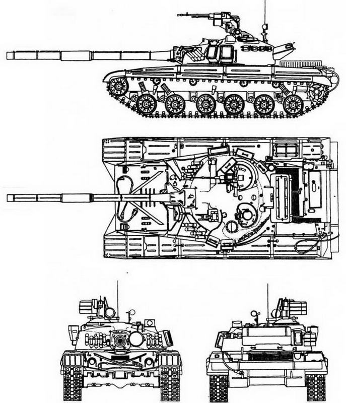 ВООРУЖЕНИЕ: 1 пушка 2А46 калибра 125 мм, 1 пулемет ПКТ калибра 7,62 мм, 1 зенитный пулемет НСВТ калибра 12,7 мм, 12 пусковых установок калибра 81 мм для пуска дымовых гранат.
