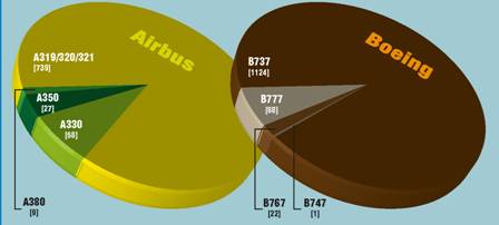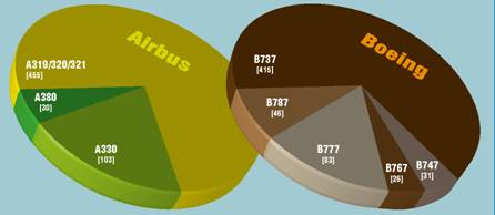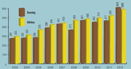 Следует отметить, что, несмотря на смену лидера, существенный рост поставок в 2012 г. продемонстрировали обе компании. У Boeing он составил 26 % (заказчикам передано на 124 самолета больше, чем годом ранее), у Airbus — 10 % (прирост в 54 лайнера). В общей же сложности к заказчикам в минувшем году отправилось 1189 американских и западноевропейских дальне- и среднемагистральных лайнеров, что на 178 самолетов (или почти 18 %) больше, чем в 2011 г., и опять-таки является абсолютным мировым рекордом.
