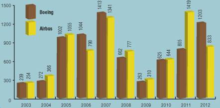 Европейский консорциум Airbus впервые за последнее десятилетие уступил позиции своему заокеанскому конкуренту, хотя и установил свой собственный рекорд по поставкам. По итогам 2012 г. европейские авиастроители передали 89 заказчикам, из которых 17 — новые, в общей сложности 588 авиалайнеров совокупной каталожной стоимостью 75,7 млрд долл., что стало наивысшим достижением Airbus и на 10 % превысило результат 2011 г.