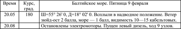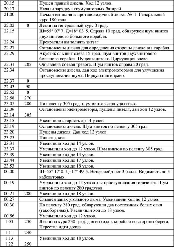 3. 9 февраля в 22.15 ШП обнаружил шум большого двухвинтового корабля. Умело используя акустику, определил сторону движения противника и на большом ходу сблизился с ним. Сблизившись, визуально четко установил, что идет легкий крейсер типа „Эмден“ в охранении трех миноносцев в ночном ордере. В 2.50 10 февраля атаковал кормовыми, стрелял интервально двумя торпедами, попадания торпед наблюдал…».