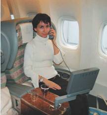 Как большой любитель разных электронных «штучек», или «девайсов» на современном молодежном жаргоне, я немедленно приступил к изучению новой для меня игрушки. В углублении под экраном находится пульт управления этим чудом техники, который напоминает трубку телефона. Шнур, связывающий пульт с устройством, намотан на подпружиненную внутреннюю катушку, и вы легко можете установить его оптимальную именно для вас длину, чтобы не тянуться к экрану и не запутываться в слишком длинном кабеле. Кстати, выяснилось, что пульт не просто напоминает телефон, он им и является! Самое простое, что вы можете сделать, это совершенно бесплатно набрать номер кресла другого пассажира и поговорить с ним (или с ней: представьте, что через проход и на два ряда дальше от вас сидит очаровательная незнакомка, и ее номер теле : фона ярко обозначен прямо над ее головой!). В той же трубке имеется щель, проведя по которой своей кредитной картой, вы можете позвонить своим знакомым, где бы они ни находились, и делать это можно в любой фазе полета. Стоимость такого звонка, в общем, вполне доступна: 5 условных зеленых единиц в минуту – не очень много, чтобы удивить своего приятеля фразой: «Я тут над Индийским океаном пролетаю, так что – привет!»