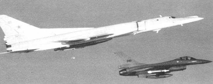 Ту-22М2 в сопровождении истребителя F-16 во время полета над нейтральными водами