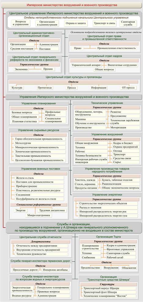 В состав Имперского министерства вооружений и военного производства входили бюро министерства, центральное управление и семь управлений. Основными подразделениями центрального управления являлись центральные отделы: 1) административно-организационный; 2) генерального референта по экономике и финансам; 3) права и промышленной ответственности; 4) кадров; 5) культуры и пропаганды. Каждый центральный отдел состоял из отделов или управленческих групп. Кроме того, пять отделов, которые занимались вопросами управления, организации и администрирования, охраны и защиты, транспортом и связью, санитарной службой, находились в непосредственном подчинении начальника центрального управления.