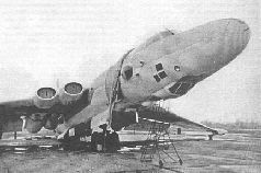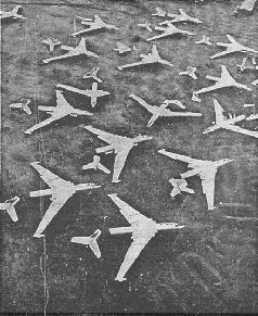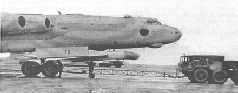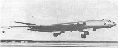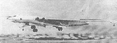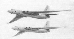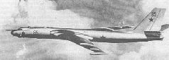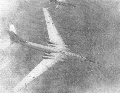 1 мая 1954 года новый бомбардировщик был впервые показан широкой публике. Четверка МиГ-17, сопровождавшая гиганта, особенно ярко подчеркивала его размеры. Морально-пропагандистский эффект, вызванный этой демонстрацией воздушной мощи, трудно переоценить. Однако на деле все обстояло не так хорошо. Войсковые испытания самолета, проводившиеся на авиабазе Энгельс, показали недостаточную дальность полета бомбардировщика. В I I I была записана цифра 12000 км, на практике же с максимальной нагрузкой было покрыто расстояние лишь 6500 км, а с пятью тоннами бомб - 8000 км.
