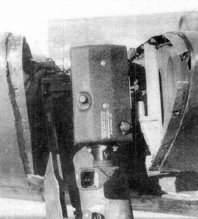 Крепление фотокинопулемёта «Фэйрчайлд» на правой стойке шасси; обтекатель снят.