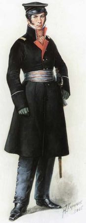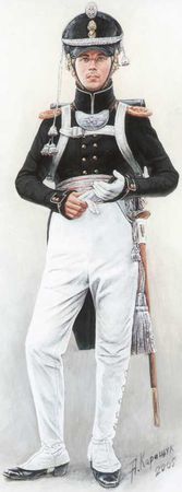 Офицер 2-го морского полка в походной форме. 1812–1814 гг. Рисунок художника А.В. Каращука. 2005 г.