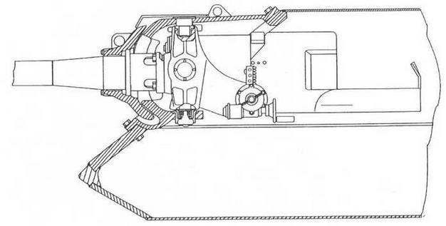 4) сложность формы бронезащиты орудия из-за несовпадения центров вращения бронировки в вертикальной и горизонтальной плоскостях, недостаточная надежность крепления бронировки к люльке орудия, имеющей толщину всего 4 мм;