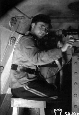Командир башни на своем посту с перископическим прицелом и переговорными трубами. За спиной командира видно крепление башенной брони гужонами через упругие связи. 9.07.1942 г.