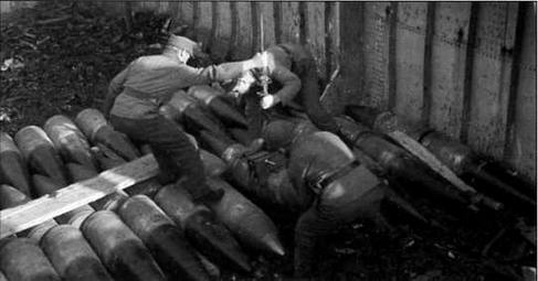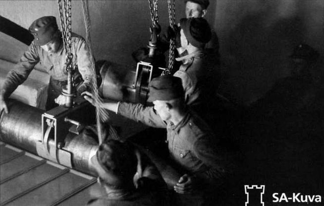 Погрузка на баржу 305-мм снарядов при эвакуации Мякилуото. С длинными черными носами - модернизированные финнами русские снаряды обр. 1907 г., с более тупыми с латунными наконечниками - русские фугасные снаряды обр. 1911 г. 20.09.1944 г.