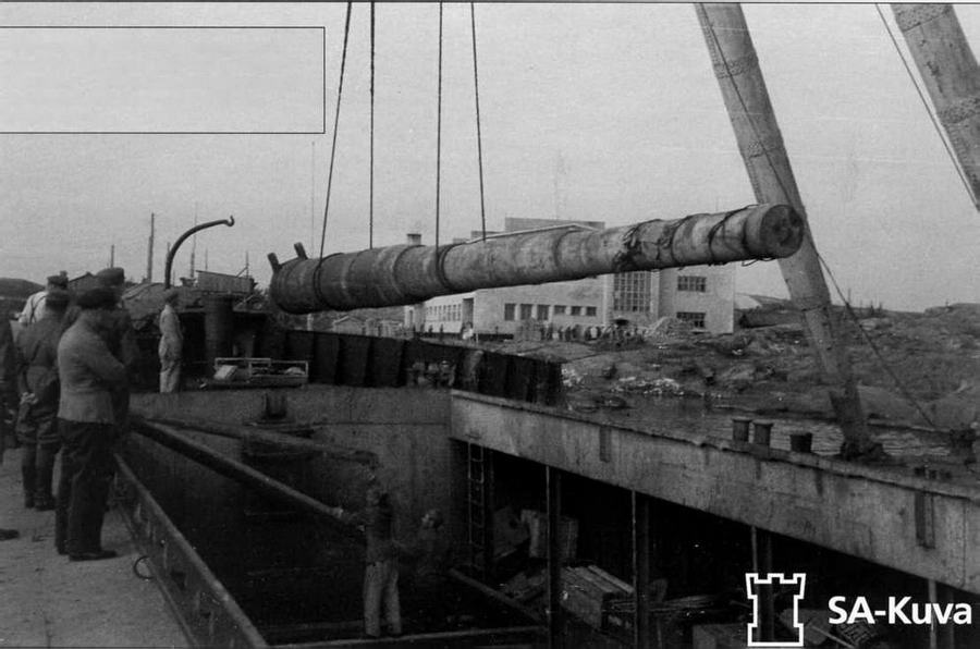 Финны эвакуируются с Мякилуото. Погрузка на баржу 305-мм стволов №91МАи 119МА, предназначавшихся для установки во второй башне. 20.09.1944 г.
