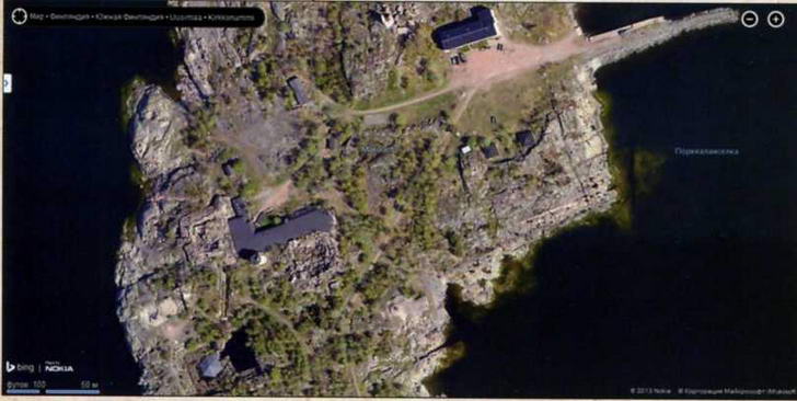 Современная спутниковая съемка позиции бывшей русской батареи №20, бывшей финской батареи №1 "форта Мякилуото", бывшей советской батареи №374... На позиции третьего блока под крышей-зонтиком расположен резервуар для воды. Слева и ниже серой крыши казематированного сооружения в центре фото видны развалины, соответственно, второго и первого блоков. Между ними расположена цилиндрическая вышка командного поста, построенного финнами в 1960-х гг. Вверху снимка, слева от здания с темно-серой крышей, видны развалины вышки КП, построенной финнами в 1935 г.