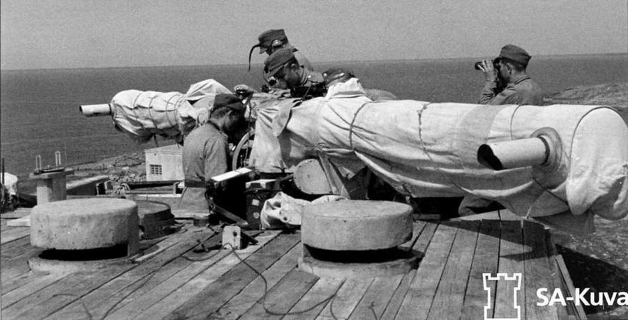 1939-44 гг. Вторая Мировая война. Перед советско-финской («Зимней») войной 1939-40 гг. финское командование поставило задачу батареям на островах Мякилуото и Куйвасаари в сотрудничестве с эстонской батареей на острове Аэгна ограничивать свободу передвижения советского флота в Финском заливе. Однако тяжелые ледовые условия не позволили советским кораблям развернуть активные боевые действия против финского побережья, ограничившись редкими обстрелами, так что 305-мм батарея Мякилуото не смогла себя проявить. Советские самолеты несколько раз бомбили Мякилуото, не попав по целям на острове из-за большой высоты сбрасывания бомб. ПВО острова была усилена установкой нескольких зенитных орудий. В феврале 1940 г. из частей береговой обороны был сформирован батальон, принявший участие в тяжелых боях на Карельском перешейке. В начале 1941 г. личный состав батареи насчитывал 200 человек. В начале Великой Отечественной войны (или, как ее называли финны, «Войны-продолжения») в июне-июле 1941 г. советские самолеты усиленно бомбили остров, правда, без особых успехов. Свою первую стрельбу по советским кораблям 305-мм батарея №1 «форта Мякилуото» провела 3.07.1941 г. Батарея в 18:16-18:40 (время указано московское, финское время на час назад) сделала 4 безрезультатных выстрела на дистанцию 23 км по ставившим мины в районе о. Нарген минзагу «Марти» и трем тральщикам, пока цели не скрылись за поставленной торпедными катерами дымовой завесой. При заряжании первого снаряда в правый ствол 305-мм орудия оторвался трос зарядника, так что он заблокировался в верхнем положении. В результате стрельбу вел только левый ствол, однако его вертикальное наведение осуществлялось вручную, так как электропривод находился в ремонте. Третий снаряд лег довольно близко от минзага, однако повреждений корабль не получил.