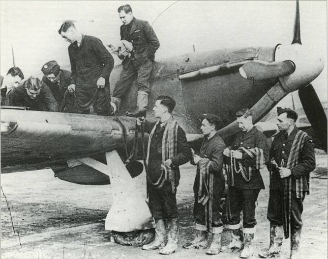 Техперсонал 249-й эскадрильи укладывает пулемётные ленты в крыльевые отсеки «Харрикейна».
