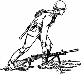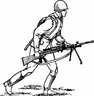 В зависимости от характера местности и наличия укрытий пулеметчики выдвигаются на огневую позицию перебежками или переползанием. При перебежке сошка должна быть разведена, а при переползании сложена. При перебежке пулемет держать одной рукой за рукоятку или двумя руками, как удобнее (рис. 46). Если до смены огневой позиции велась стрельба, при выдвижении на следующую огневую позицию (на короткое расстояние) пулемет можно не разряжать, но обязательно поставить на предохранитель. Помощник наводчика в этом случае передвигается одновременно и рядом с наводчиком, перенося коробку с лентой.