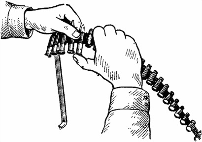 105. Если лента не была снаряжена патронами, то по команде «Заряжай» снарядить ленту патронами. Для снаряжения ленты нужно положить ее на ладонь левой руки наконечником к себе, передним краем влево и придерживать большим пальцем. В правую руку взять патроны и вставлять их в звенья ленты так, чтобы срез дульца гильзы совмещался с наружным срезом переднего края ленты (рис. 54).