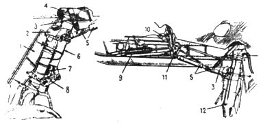 1 — щиток стойки; 2 — верхнее звено; 3 — пружинно-пневматический цилиндр аварийного выпуска шасси; 4 — шкворень шасси; 5 — ломающийся подкос; 6 — пневматическая проводка к тормозам; 7 — шток амортизационной стойки; 8 — нижнее звено; 9 — силовой цилиндр уборки шасси; 10 — замок убранного положения шасси; 11 — замок выпущенного положения шасси; 12 — амортизационная стойка шасси