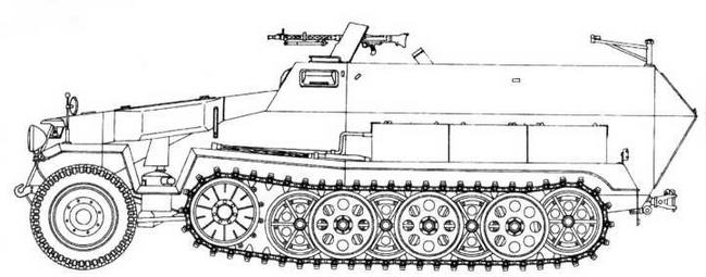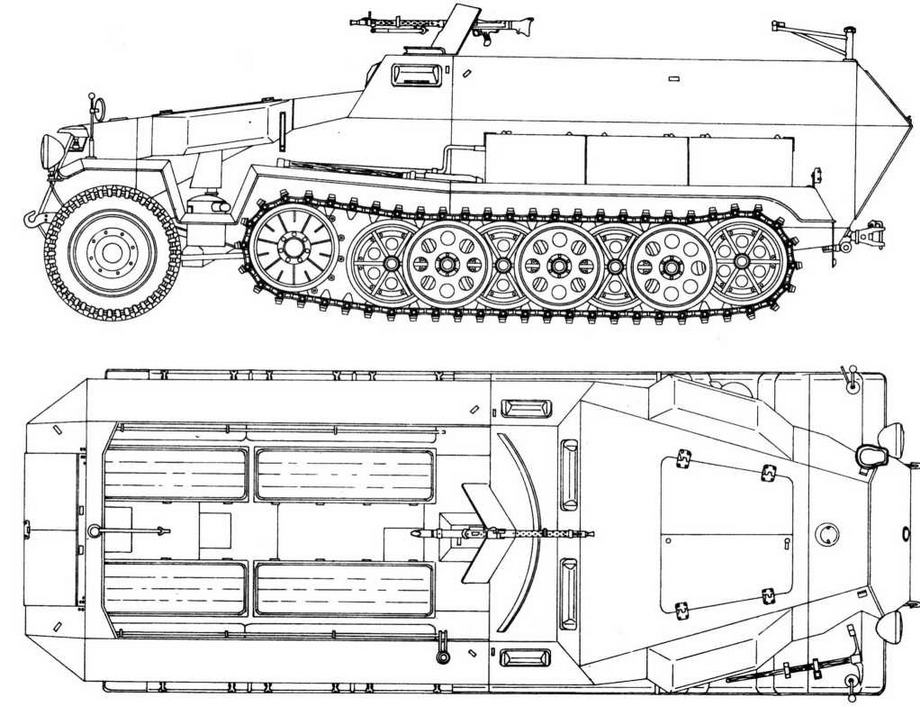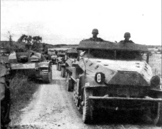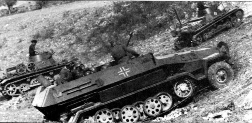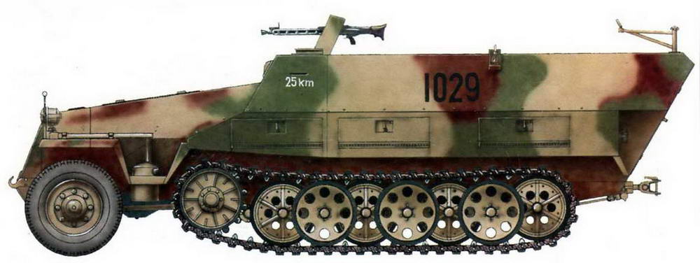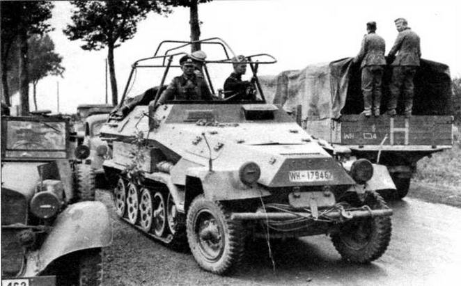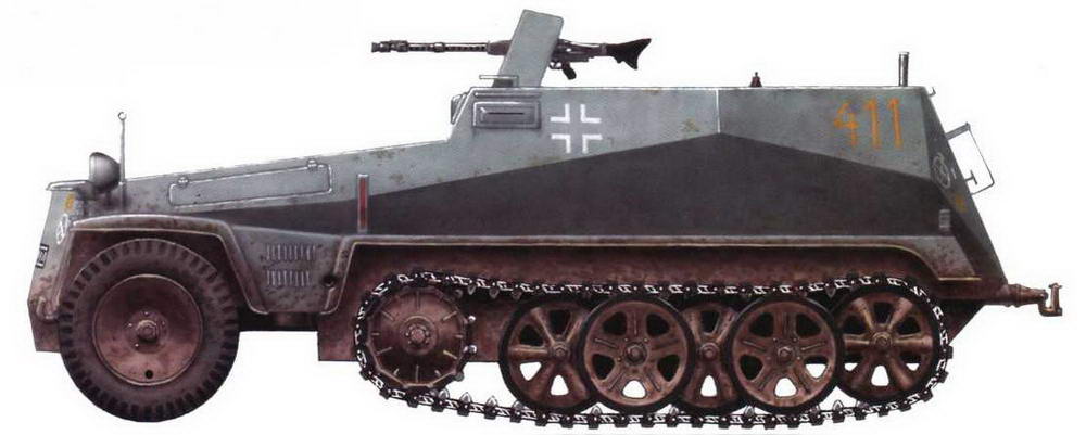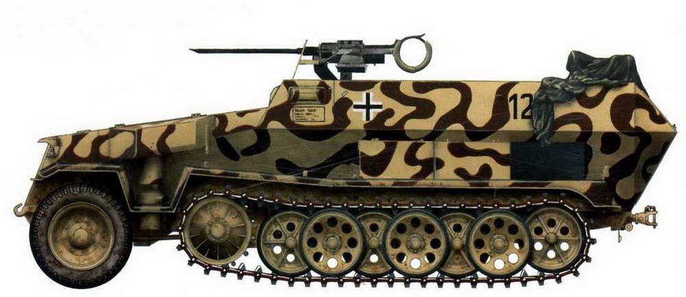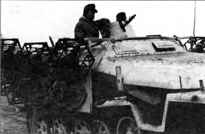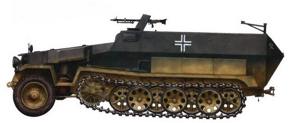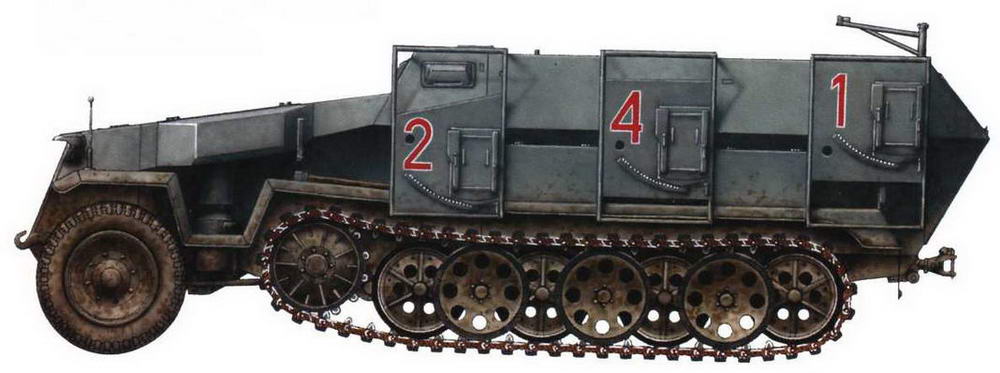 Наиболее же массово бронетранспортеры Sd.Kfz.251 всех модификаций использовались на советско-германском фронте. Укомплектованность ими танковых и моторизованных частей была разной. Скажем, в начале операции «Барбаросса» превалирующее количество машин этого типа находилось на вооружении 1-й танковой дивизии, где первые батальоны 1-го и 113-го стрелковых полков (Schutzen Regiment)—так официально до 1943 года именовалась мотопехота Вермахта—имели Sd.Kfz.251. В 14-й же, 16-й и 19-й танковых дивизиях бронетранспортеров не было вообще. Такое положение сохранялось вплоть до конца войны как из-за все увеличивавшегося числа танковых и моторизованных соединений, так и по причине все возраставших потерь.