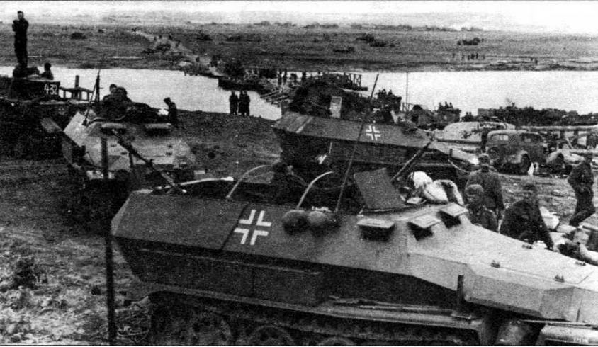 Бронетранспортеры Sd.Kfz.251 Ausf.C 24-й танковой дивизии на переправе. Восточный фронт, 1941 год