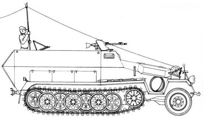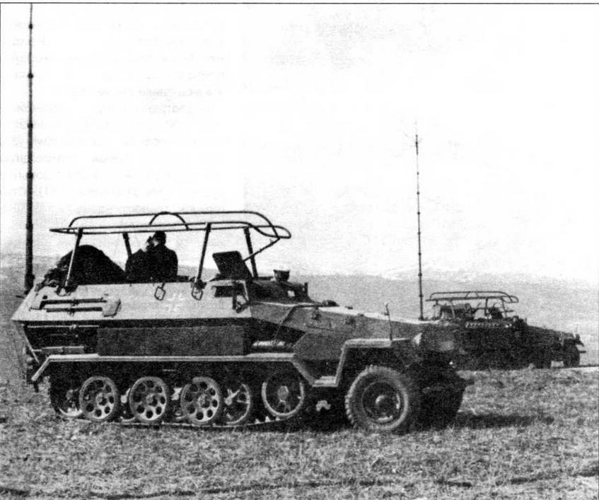Машина артиллерийской разведки и управления огнем — mittierer Messtrupp und Geratpanzerwagen Sd.Kfz.251/12 — комплектовалась радиостанцией Fu 8 с рамочной антенной. Экипаж—6 человек. Эти машины выпускались до середины 1943 года.