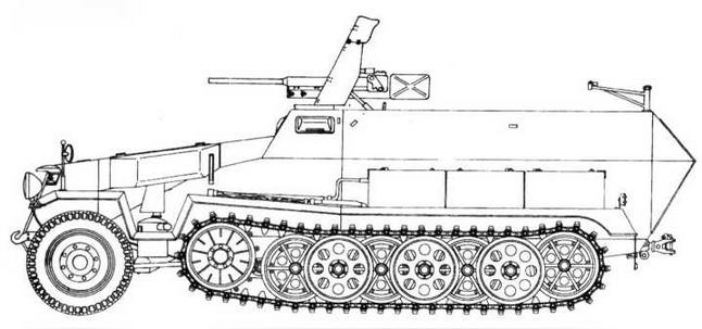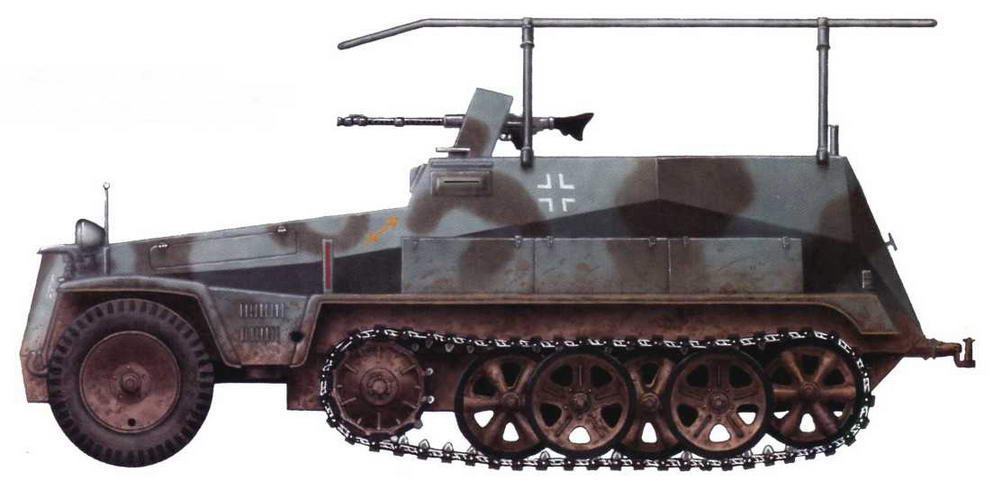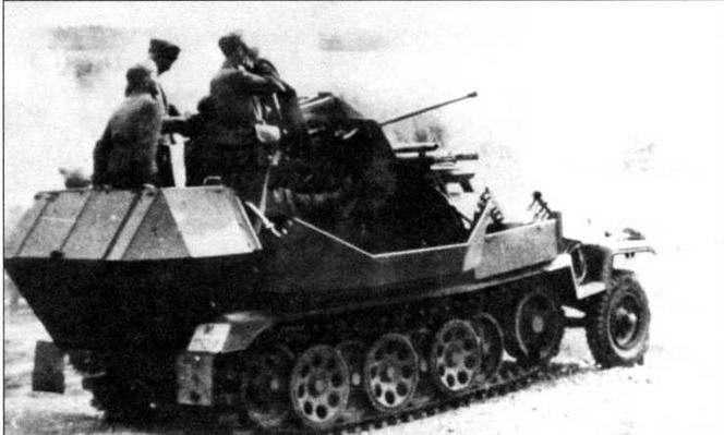 Самоходная зенитная установка—mittlerer Schutzenpanzerwagen mit 2 cm Flak 38—Sd.Kfz.251/17. Автоматическая зенитная пушка Flak 38 калибра 20 мм была установлена за штатным щитом в середине кузова с откидными бортами. Боекомплект—600 выстрелов. Боевая масса—8,8 т, экипаж—4— 6 человек. Дополнительное вооружение—два пулемета MG 34. В откинутом положении борта образовывали площадку для расчета. С 1943 года было изготовлено 211 единиц.