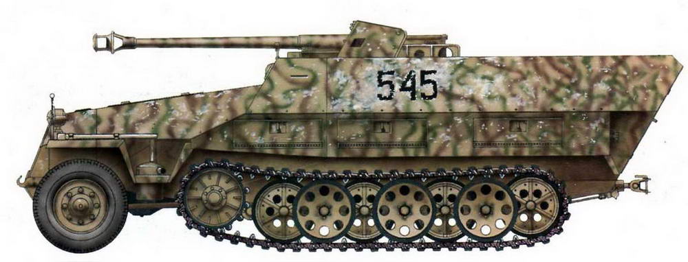 Самоходную артиллерийскую установку представляла собой и следующая модификация—Sd.Kfz.251/22 (mittlerer Schtitzenpanzerwagen mit 7,5 cm Рак 40). Противотанковая 75-мм пушка Рак 40/1 устанавливалась за штатным щитом в передней части кузова на лафете, идентичном применяемому в бронеавтомобиле Sd.Kfz.234/4 Puma. Углы горизонтального наведения—20° влево и 18° вправо, вертикального—от-3°до+48°. Боекомплект—22 выстрела. Расчет пушки состоял из 4 человек: командира, наводчика и двух заряжающих. С декабря 1944 года до конца войны изготовлено 268 таких машин. Танковая дивизия «образца 45» должна была иметь девять Sd.Kfz.251/22 в противотанковом дивизионе, три—в разведывательном батальоне и шесть—в танковых подразделениях. Впрочем, войсковая эксплуатация вскоре показала, что машина перегружена, из-за этого частым явлением были поломки переднего моста. Последняя модификация—Sd.Kfz.251/23 (mittlerer Schutzenpanzerwagen mit 2 cm KwK 38)—бронетранспортер с 20-мм автоматической пушкой и пулеметом MG 42 в башне типа Hangelaffete 38, такой же, как у бронеавтомобилей Sd.Kfz.234/1. Углы вертикального наведения колебались в пределах от -10° до +85°. В боекомплект пушки входило 100 выстрелов, пулемета— 2010 патронов. Машина оснащалась радиостанцией Fu 12. Экипаж состоял из 4 человек. Серийный выпуск модификации Sd.Kfz.251/23 начался в декабре 1944 года.