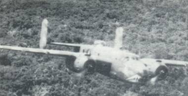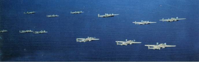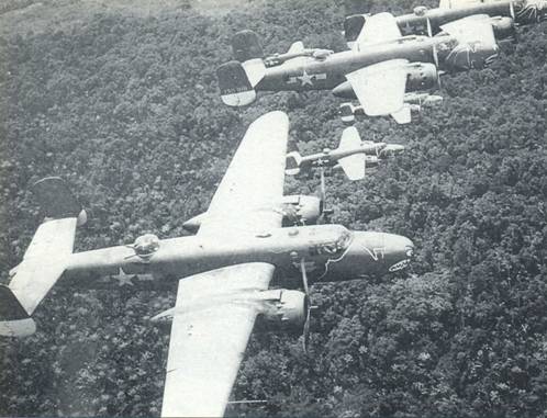 Эскадрилья «Митчеллов» идёт на цель. Обратите внимание на окраску, выгоревшую под тропическим солнцем на большинстве бомбардировщиков до желтизны .