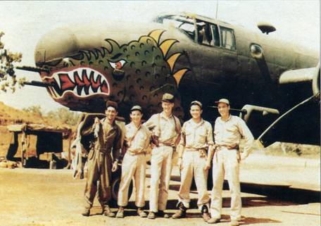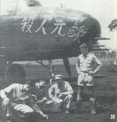 Экипаж майора Уилкинса позирует на фоне своего «Митчелла» (лето 1943 г.). Японская фраза, написанная иероглифами на носу машины означает «Поцелуй смерти». Эту надпись после её появления хотели было внести в эмблему эскадрильи, но по ряду причин от этого решили отказаться и в последствии этот шедевр японской калиграфии красовался только на этом самолёте.