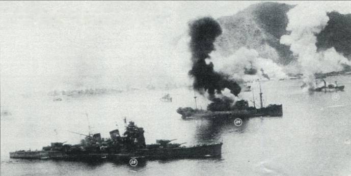 Тяжёлый крейсер «Хагуро», за ним виден горящий транспорт «Хакусан Мару» (10.380 брт), справа в глубине – тонущий «Хокуйо Мару»(4217 бр.т). Рабаул, 2 декабря 1943 г.
