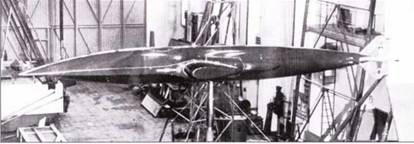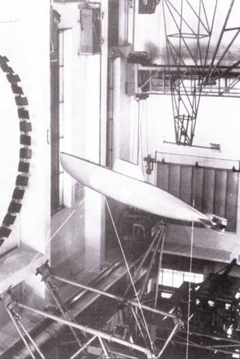 Модели подлодок Вальтера Wa 201 и WK 202 (вверху) перед аэродинамической трубой научно-исследовательского авиационного института в Брауншвейге. Там изучалось действие рулевого управления при использовании различных моделей руля. Полученные измерения моментов на балере руля показали, что лучше управляемость на высоких скоростях у подлодки проекта верфи Блом и Фосс. При небольших скоростях были получены неожиданные экспериментальные результаты, опубликованные уже после войны Вальтером (13.7.45) и Гиблером (14.12.46).