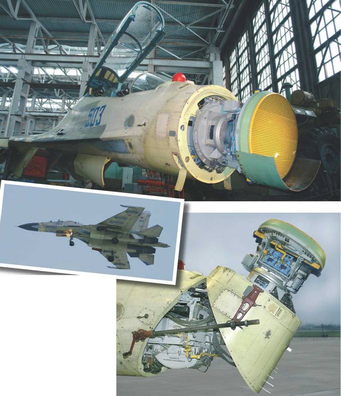 Итак, что же нового реализовано в конструкции Су-35? Во-первых, истребитель получит усовершенствованный планер с усиленной конструкцией, что позволит добиться существенного увеличения ресурса самолета – до 6000 ч или 30 лет эксплуатации (ресурс до первого контрольно-восстановительного ремонта и межремонтный повышен до 1500 ч или 10 лет эксплуатации). По аэродинамической схеме он аналогичен самолету Су-27 – в отличие от Су-30МКИ на нем не будет уже переднего горизонтального оперения, при этом во всех трех каналах будет реализовано электродистанционное управление, без механической проводки. Применение новой комплексной системы управления КСУ-35, разрабатываемой МНПК «Авионика» и выполняющей функции сразу нескольких систем, применявшихся раньше на самолетах Су-27 (системы дистанционного управления, систем автоматического управления, ограничительных сигналов, воздушных сигналов, управления торможением колес шасси, управления поворотом передней стойки) повысит пилотажные и маневренные возможности истребителя. КСУ-35 одновременно будет выполнять функции активной безопасности.