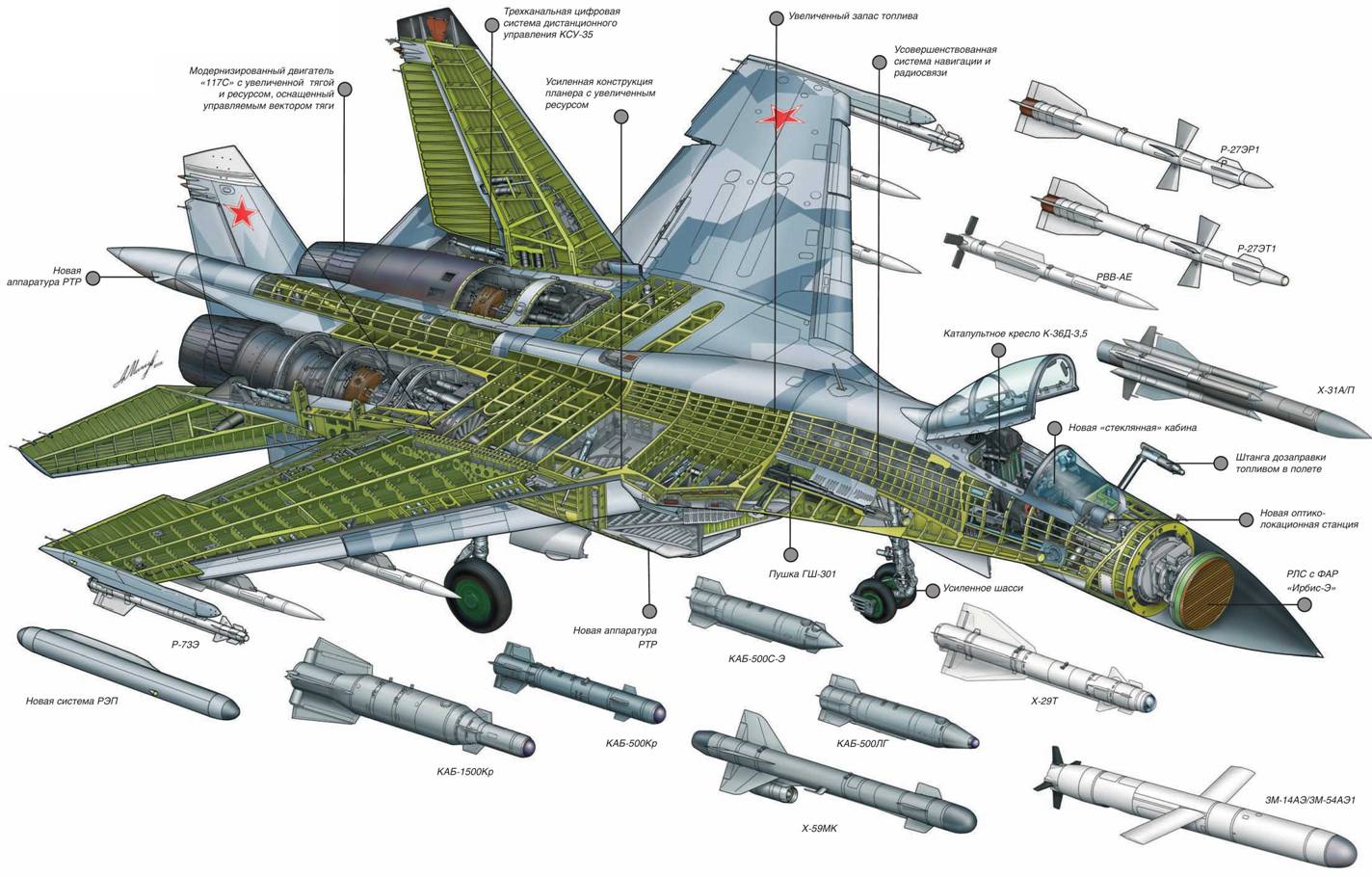 В состав вооружения Су-35, помимо уже известных ракет «воздух-воздух» средней дальности Р-27ЭР1 (8 шт.), Р-27ЭТ1 и Р-27ЭП1 (по 4 шт.), РВВ-АЕ (до 12 шт., включая спаренную подвеску четырех ракет под фюзеляжем) и ракет ближнего боя Р-73Э (6 шт.), войдут пять новых ракет большой дальности. Номенклатура управляемого вооружения класса «воздух-поверхность» включает шесть тактических ракет Х-29ТЕ или Х-29Л, шесть противокорабельных и противорадиолокационных ракет Х-31А и Х-31П, пять новых противокорабельных ракет большой дальности Х-59МК, а также новинки: пять противорадиолокационных ракет увеличенной дальности типа Х-58УШЭ, три ракеты большой дальности системы «Клаб» («Калибр-А») и одну тяжелую противокорабельную ракету большой дальности типа «Яхонт». В числе применяемых корректируемых бомб – до восьми бомб КАБ-500Кр (ОД) с телевизионным самонаведением, новейших КАБ-500С-Э со спутниковой системой наведения, а также до трех бомб калибра 1500 кг – КАБ-1500Кр или КАБ-1500ЛГ с телевизионным или лазерным наведением. По номенклатуре бомбардировочного и неуправляемого ракетного вооружения Су-35 в целом не отличается от сегодняшних Су-30МК, но в перспективе на нем смогут применяться усовершенствованные и новые модели авиабомб калибра 500 и 250 кг и ракет калибра 80, 122 и 266/420 мм, в т.ч. с лазерной коррекцией. Максимальная масса боевой нагрузки Су-35 составляет 8000 кг, она размещается на 12 точках подвески.