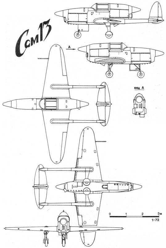 Это был одноместный двухмоторный истребитель, спроектированный под руководством А.С.Москалева в 1940 г. Идея его создания состояла в том, чтобы дать легкий дешевый истребитель с хорошими летными данными. Конструкторы применили новую, не встречавшуюся ранее в СССР, аэродинамическую компоновку: двухбалочный моноплан с коротким фюзеляжем, в носовой и хвостовой частях которого располагались два французских рядных мотора воздушного охлаждения "Рено" по 236 л.с.. Они вращали соответственно тянущий и толкающий винты. Летчик размещался между моторами.* При такой схеме обеспечивался наименьший мидель фюзеляжа, поскольку моторы вписывались в габариты кабины пилота. Шасси – с носовым колесом. Вооружение должно было состоять из четырех пулеметов ШКАС калибра 7,62 мм (при испытаниях самолета пулеметы не ставились). По расчетам конструкторов максимальная скорость САМ-13 на высоте должна была превышать 600 км/час.