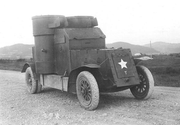 Бронеавтомобили на учениях японских частей, дислоцирующихся в Китае. 1933 год. Слева бронеавтомобиль Chiyoda-O («Остин»), справа Vickers-Crossley. Машины имеют армейский трехцветный камуфляж с черной полосой, разделяющей цвета. Башни обернуты полосками белой ткани для отличия «своих» от «чужих» (из коллекции К. Йошикава).