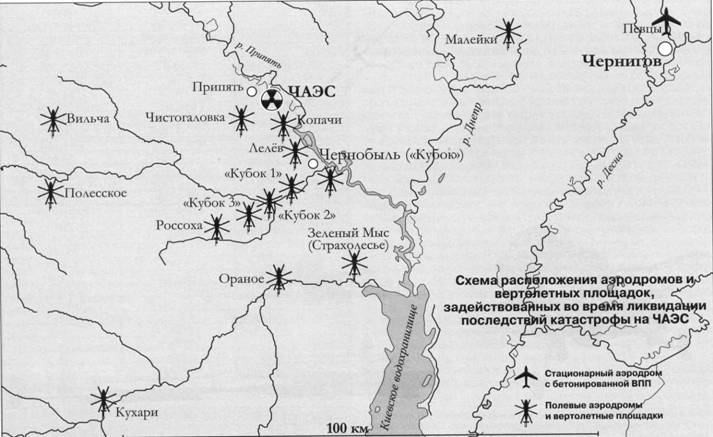 Для базирования участвовавшей в ЛПК авиации использовался целый ряд аэродромов и полевых площадок. Так, первоначально основной базой для тяжелых вертолетов Ми-6 и Ми-26 стал аэродром Певцы, который продолжало использовать ЧВВАУЛ, ведь план летной подготовки курсантов никто не отменял. Однако в результате проведения дезактивации вертолетов там стал стремительно расти уровень радиационного загрязнения, и уже 29 апреля винтокрылые машины перебазировали в Малейки. Певцы продолжали играть важную роль в проведении ЛПК. Там принимали транспортные самолеты, литерные борта различных министерств, прилетали в Певцы и Су-24МР из 10-го ОРАП (Щучин), выполнявшие воздушное фотографирование зоны ЧАЭС. Основной базой для Ми-8, Ми-24Р и Ми-2 стал аэродром Гончаровское. Для повышения оперативности работы было оборудовано несколько вертолетных площадок поблизости от ЧАЭС, получивших обозначение «Кубок» (находилась в Чернобыле, использовалась для приема руксостава и различных комиссий), «Кубок-1», «Кубок-2», «Кубок-3». Каждую из них старались использовать для вертолетов одного типа, что объяснялось технологией их загрузки и методикой выполнения захода на посадку. Первоначально площадки находились в 500-800 м от аварийного реактора, но постепенно их «отодвинули» на 16-30 км. Работы по «тампонированию» реактора потребовали организовать ряд вертолетных площадок для забора песка. Одна из них была оборудована… на центральной площади Припяти, другие – на песчаном намыве возле города, а также в районах сел Лелево, Чистогаловка, Копачи, Кухари, Вильча, Оранное и некоторых других. Для руководства полетами были развернуты подвижные радиолокационные системы посадки (РСП) и стартовые командные пункты (СКП-9). На каждой из площадок «Кубка» находился руководитель полетов и бригадир, отвечавший за загрузку.
