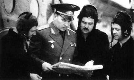 Командир экипажа вертолета Ми-8Т к-н С.И. Володин, начальник штаба ВВС КВО генерал-майор Н.Т. Антошкин, летчик-штурман ст. л-т В.Н. Бушков и борттехник к-н А.В. Паньков. 1986 г.