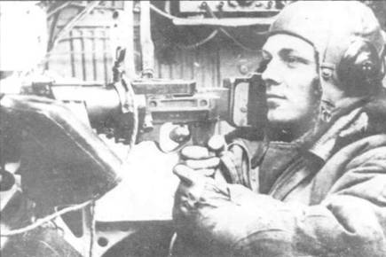 Стрелок-радист ведет огонь из бортового пулемета ШKAC