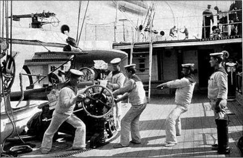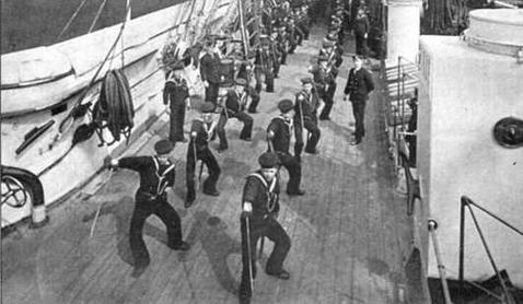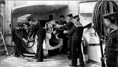 Тренировка расчета 5-дюймового орудия на корвете "Каллиопа"