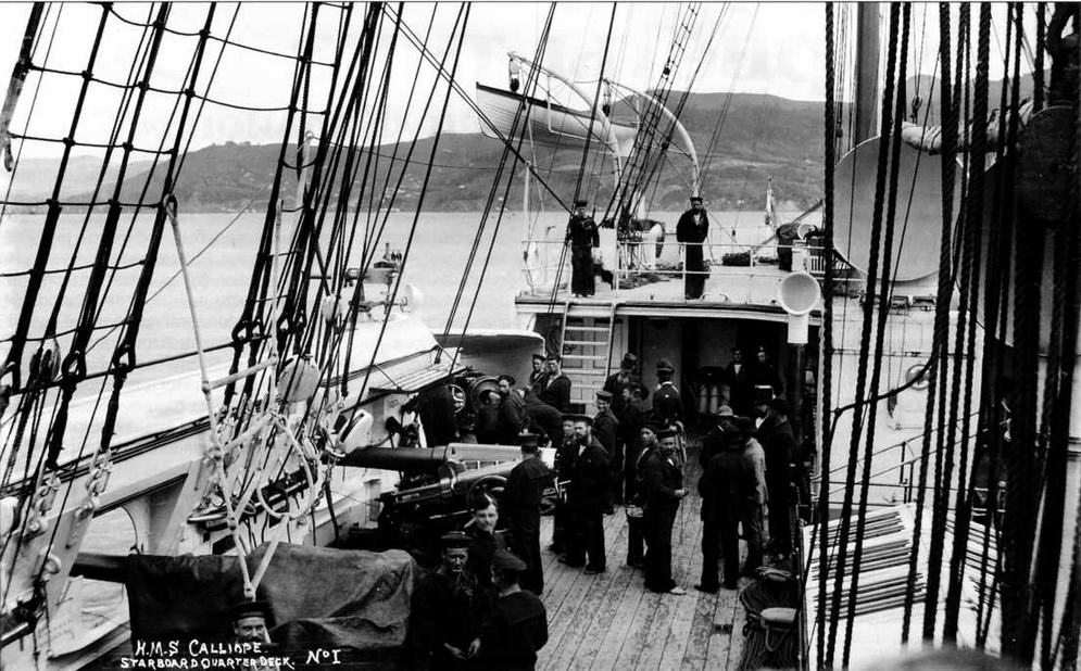 "Каллиопа"Законченный постройкой в конце 1884 г. корвет был сразу же выведен в резерв в Портсмуте и начал свою первую кампанию лишь 25 января 1887 г., отправившись на Тихий океан. Командиром корабля стал кэптен Генри Кой Кейн. Некоторое время "Каллиопа" служила на Китайской станции, но позже получила назначение на Австралийскую станцию. В конце 1887 года она прибыла в Новую Зеландию, став первым кораблем, вошедшим в новый док в Окленде, в итоге получившем название в его честь.