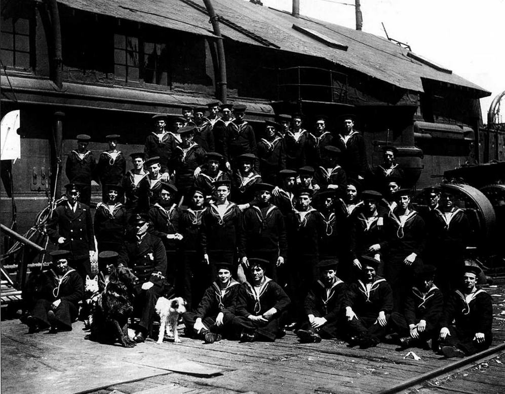 Экипаж "Калипсо" у борта своего корабля в Сент-Джонсе. Хорошо виден жилой блок, надстроенный над верхней палубой