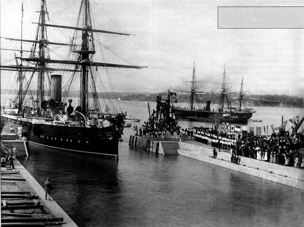 "Каллиопа" входит в док "Каллиопа" в Окленде. Обратите внимание на убранный бушприт