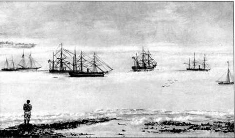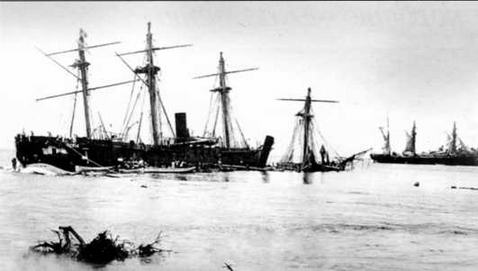 Остовы кораблей в гавани Апиа после урагана. Слева направо: фрегат "Трентон", шлюп "Вандалия" (затонул), корвет "Ольга"