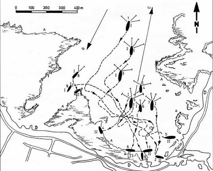 1 - "Трентон"; 2 - "Вандалия"; 3 - "Каллиопа"; 4 - "Адлер"; 5 - "Ольга"; 6 - "Эбер"; 7 - "Нипсик"; 8 - транспорт "Питер Годфруа"; 9 - транспорт "Лили" I - место якорной стоянки; 11 - место крушения А - коралловые рифы; В - направление ветра; С - курс "Каллиопы"; О - береговая линия